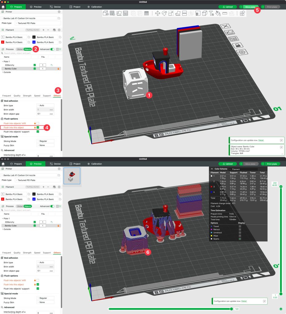 ฟีเจอร์นี้จะแตกต่าง จากฟีเจอร์ด้านบน หรือ Flush into object’s infill เพราะเป็นการฉีดเส้นทิ้งให้ขึ้นมาเป็นรูปโมเดลเลย ซึ่งจะเหมาะกับโมเดลที่ไม่ได้ซีเรียสเรื่องสี หรือเป็นโมเดลที่ต้องมีการนำไป ลงสีเอง การใช้ฟีเจอร์นี้ก็จะช่วยให้ลดของเสียที่ฉีดทิ้งออกมา สำหรับการใช้ฟีเจอร์นี้ ต้องมีโมเดลมากกว่า 2 ตัวในฐานปริ้น แล้วให้เลือกโมเดลที่ต้องการฉีดเส้นทิ้งเป็นรูป แล้วเลือกแทบ Process เป็น Object แทน Global ตัวคำสั่ง Flush into this object ก็จะปรากฎขึ้นมาให้เลือก ในหน้าแทบ Others ให้ทำการติ๊กถูก แล้วก็ Slice ตามปกติ