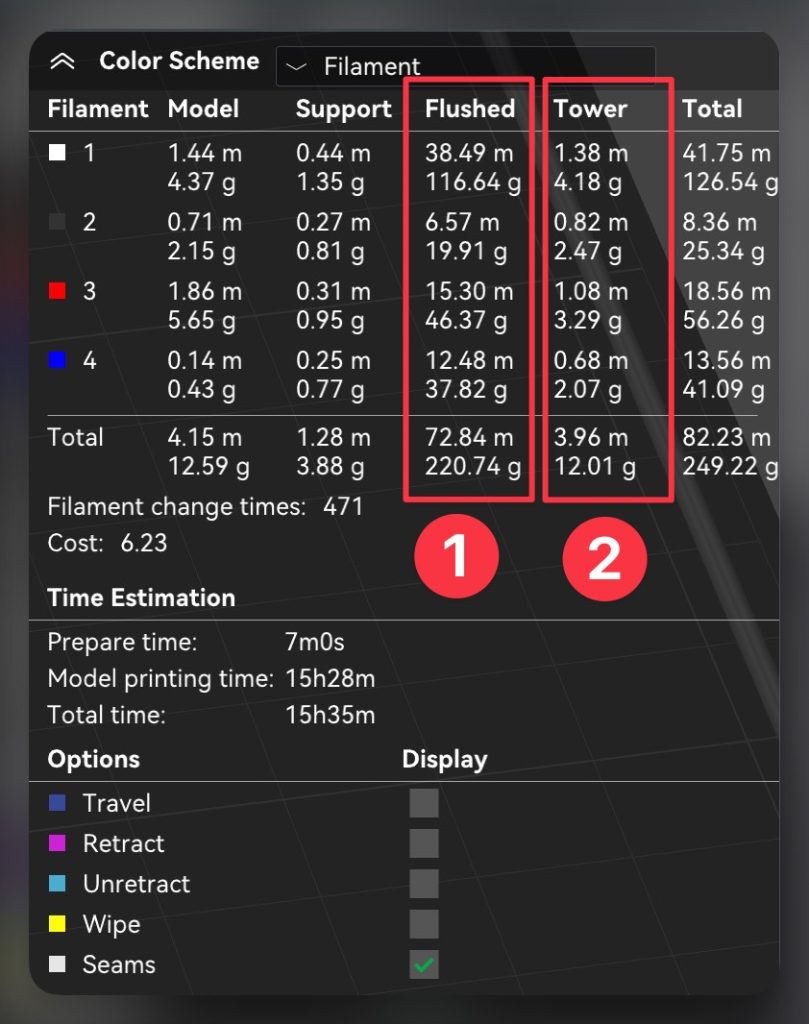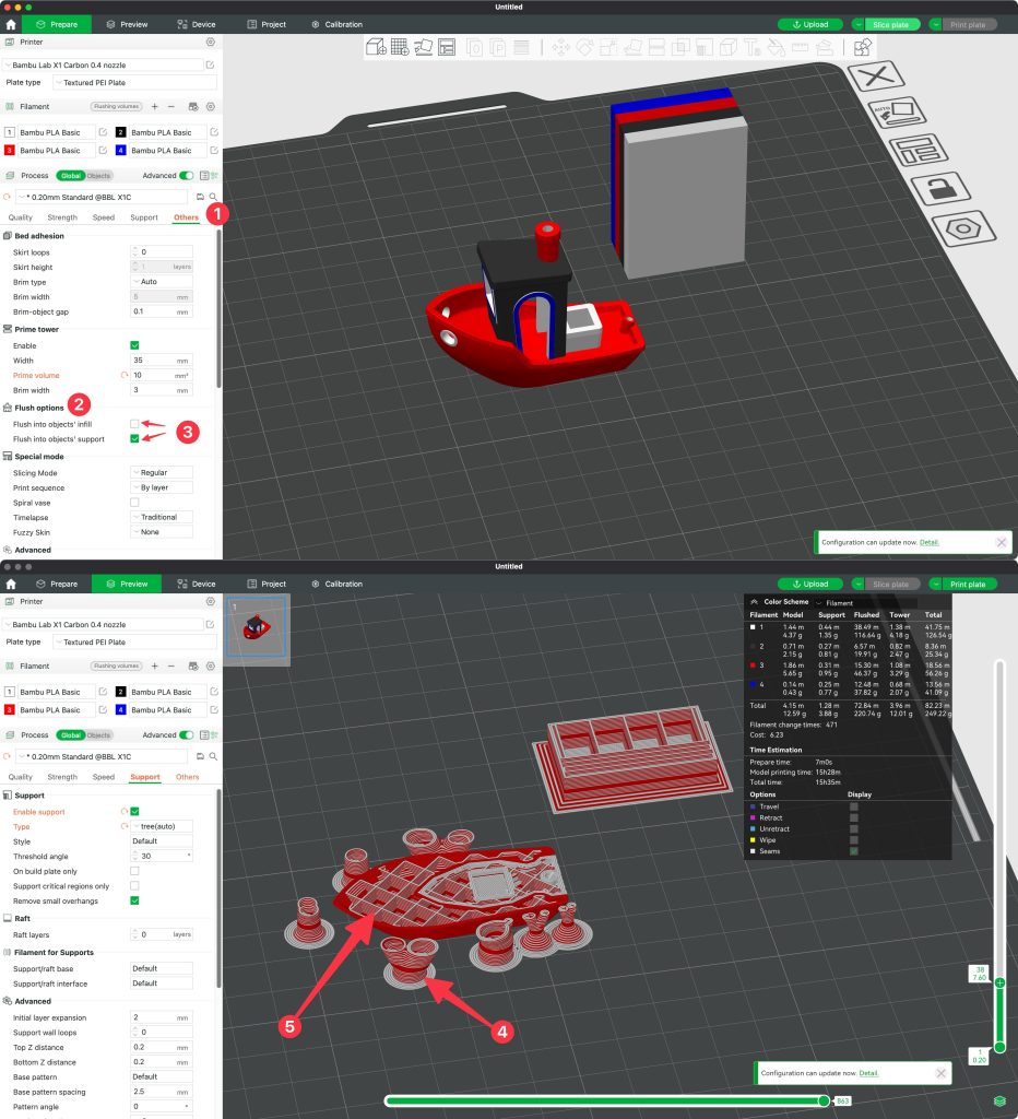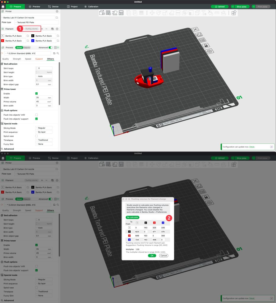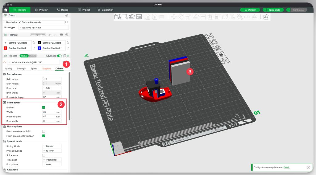 การใช้ฟีเจอร์นี้ จำเป็นต้องเปิด Prime Tower ไว้ด้วย แต่สามารถปรับขนาดของ Prime Tower ให้เล็กลงได้ เพื่อจะได้ประหยัดเส้นที่ถูกฉีดทิ้งออกมา