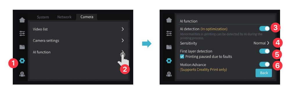 สำหรับเครื่อง K1C และ K1 Max จะมีกล้องที่มีความสามารถของ AI ติดมาด้วย ซึ่งจะสามารถตรวจเช็คงานที่กำลังปริ้นอยู่ได้ ถ้างานปริ้นมีปํญหา เช่น หลุด หรือ เส้นพลาสติกไม่ติดกัน ตัวกล้องก็จะตรวจจับได้ และแจ้งเตือน