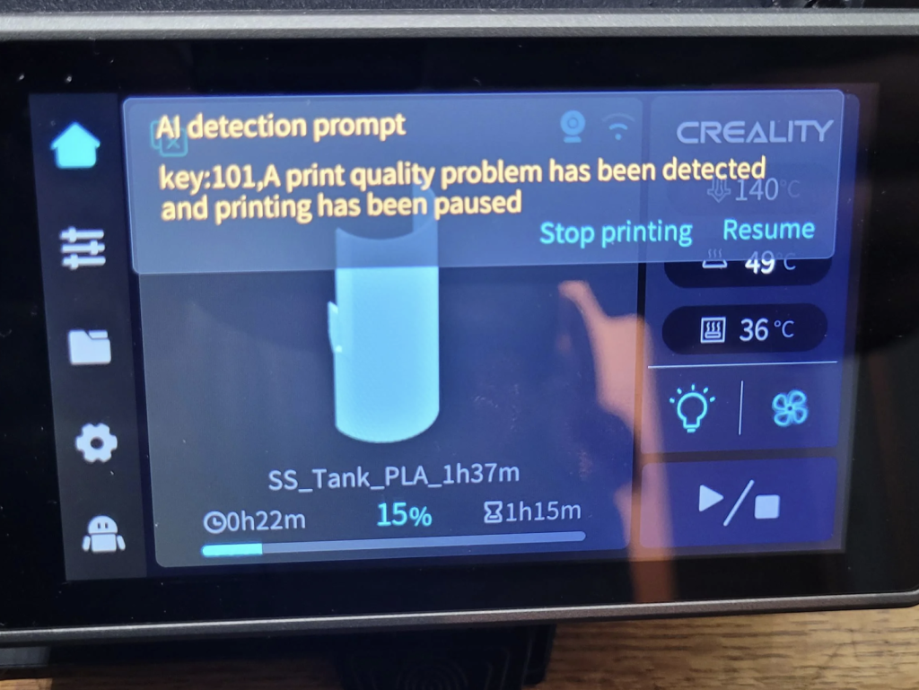 ฟีเจอร์ AI จะถูกปรับปรุงอยู่ตลอด ตามเวอร์ชั่น ของ Firmware ซึ่งตอนนี้ อาจจะยังทำงานได้ไม่เต็มที่ หรืออาจจะมีข้อผิดพลาดอยู่ ดังนั้น อย่าเพิ่งวางใจกับฟีเจอร์ AI มากนัก เน้นให้ใช้เส้นพลาสติกที่มีคุณภาพ และรอดูจนกว่า เลเยอร์แรกจะพิมพ์เสร็จ ก่อนจะปล่อยให้เครื่องทำงาน