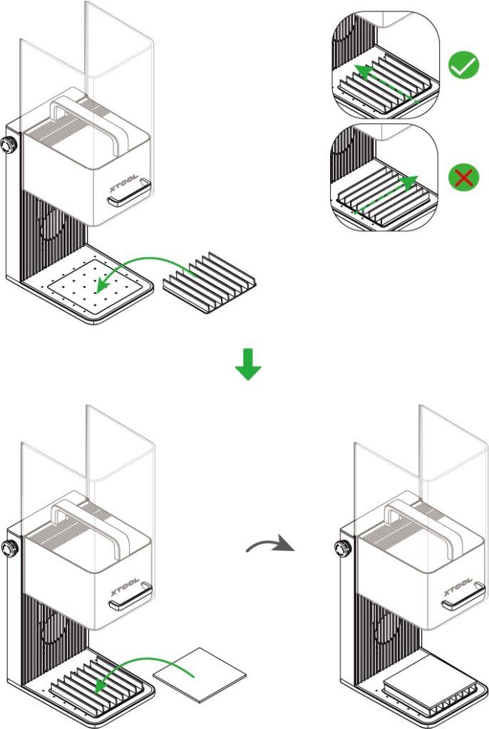 การใช้แผ่นรองอลูมิเนียมสีดำ คุณสามารถลดพื้นที่ที่ถูกเผาระหว่างการทำงานและถนอมแผ่นฐานได้ ตรวจสอบให้แน่ใจว่าตัวร่อง ต้องวางไปตามแนวยาว หันไปทางช่องดูดควัน