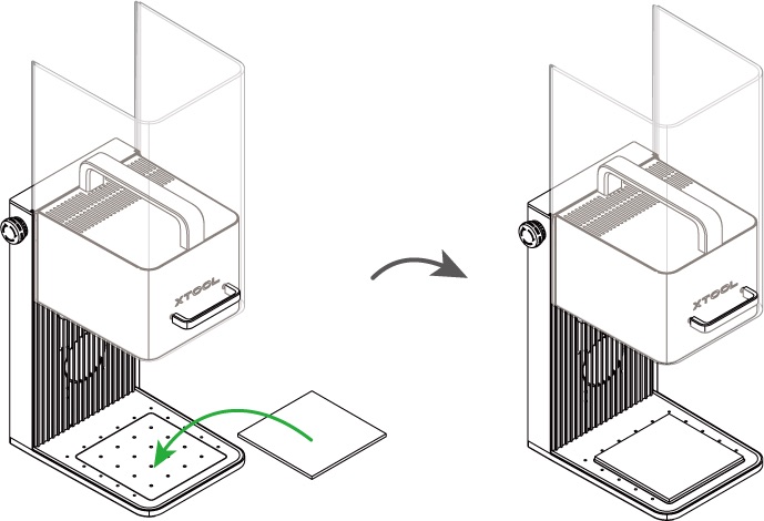 ตรวจสอบให้แน่ใจว่าได้ติดตั้งแผ่นฐานแล้ว จากนั้นวางวัสดุบนแผ่นฐาน สำหรับการตัดชิ้นงานให้ขาด จะต้องวางแผ่นรองอลูมิเนียมสีดำที่เป็นร่อง ไว้ที่ด้านล่างเครื่อง แล้วค่อยนำวัสดุที่ต้องการตัดวางไว้บนแผ่นรองอีกที ถ้าไม่ใช่แผ่นรอง จะทำให้ตัดงานไม่ขาด หรือถ้าขาด ตัวแผ่นฐานของเครื่องก็จะมีรอยไหม้และดำ