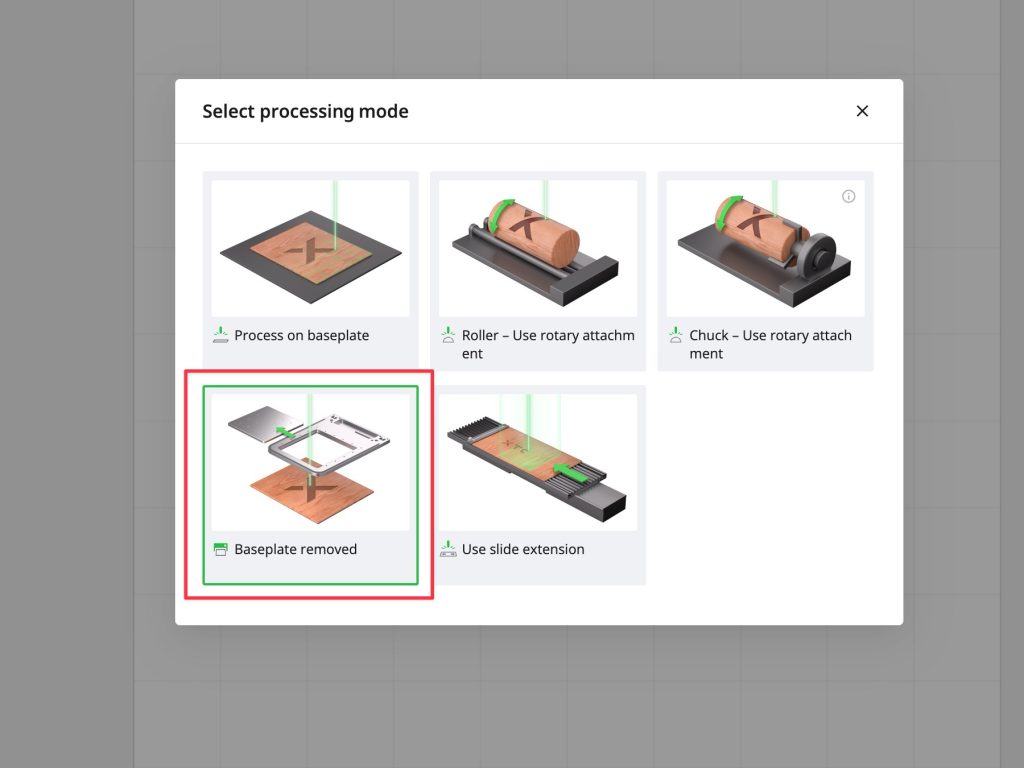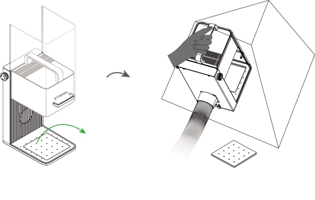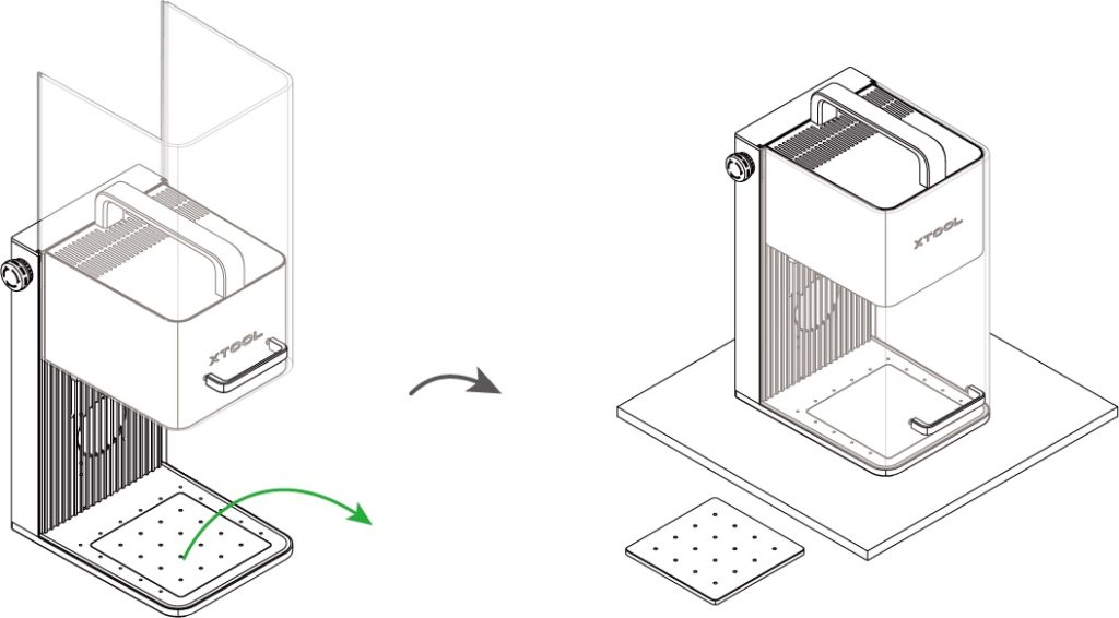 ตัวฐานเครื่อง F1 สามารถที่จะถอดออกได้ เพื่อให้พื้นที่ด้านล่างโล่ง สามารถที่จะนำเครื่องไปวางไว้ บนวัดสุที่มีขนาดใหญ่กว่าตัวเครื่องได้ เวลาที่เลือกการทำงานแบบนี้ จะต้องเลือกในโปรแกรม XCS ให้เป็น Open Plane ก่อน เพื่อจะให้ตัวหัวเลเซอร์สามารถปรับระดับโฟกัสได้