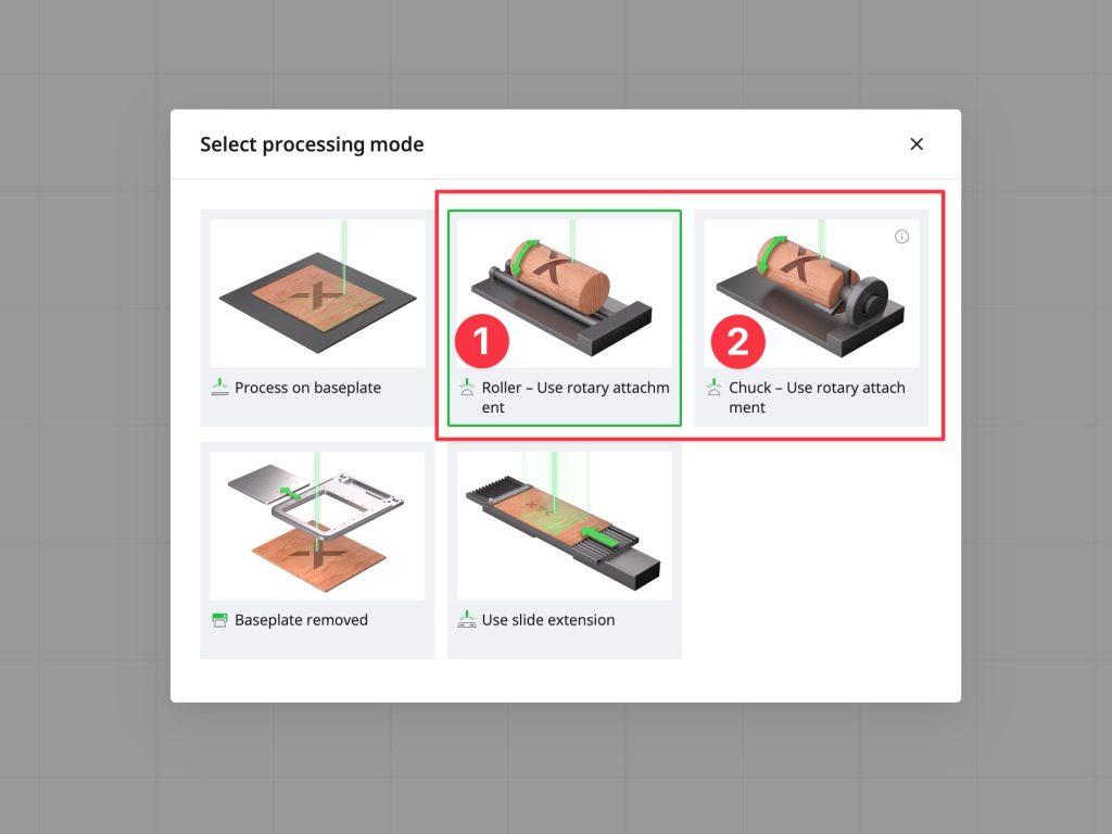 เครื่อง F1 จะมีอุปกรณ์เสริม ที่จะช่วยให้การใช้งาน มีความหลากหลายมากขึ้น ตัวอุปกรณ์ยอดนิยม ที่ใช้กันมากกับเครื่อง F1 ก็คือ ตัวโรตารี่ สำหรับจับชิ้นงานทรงกลม หรือทรงกระบอก การทำงานกับอุปกรณ์ชิ้นนี้จะต้องเชื่อมต่อ Rotary เข้ากับเครื่อง F1 ผ่านสาย USB C แล้วเลือกโหมดการทำงานเป็นแบบ Roller หรือ Chuck ในโปรแกรม XCS